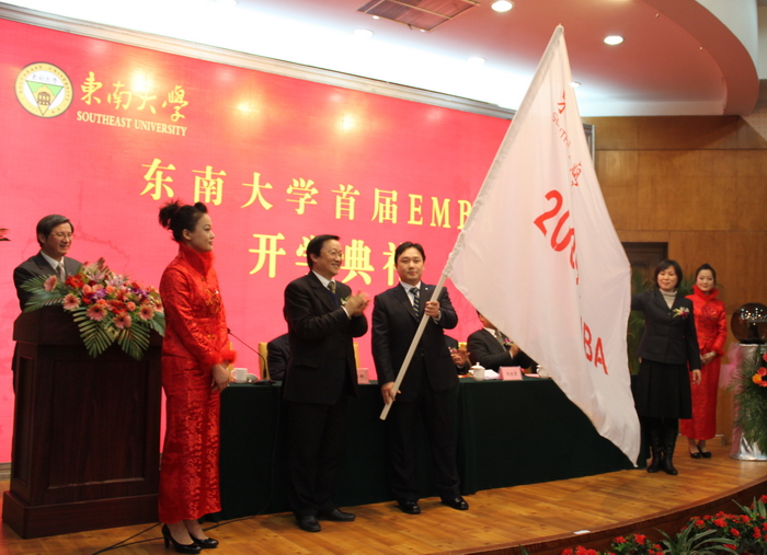 | 易红校长、赵永贤副部长与学员代表:熊猫电子集团总经理徐国飞、南京国有控股集团副总夏淑萍共同启动EMBA项目 | 易红校长向首届EMBA班级代表,南京证券公司计财部总经理刘宁、江苏熔盛重工集团副总裁张时玮同学授班旗 |