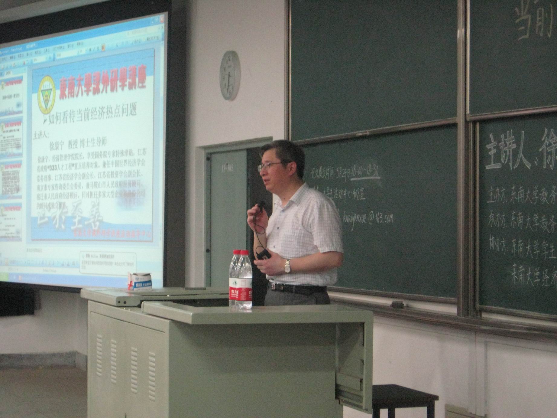 2011年5月19日18:30-20:30,新葡的京集团8814vip院长徐康宁教授在九龙湖校区教三305开设了题为《如何看待当前经济热点问题》的课外研学讲座。