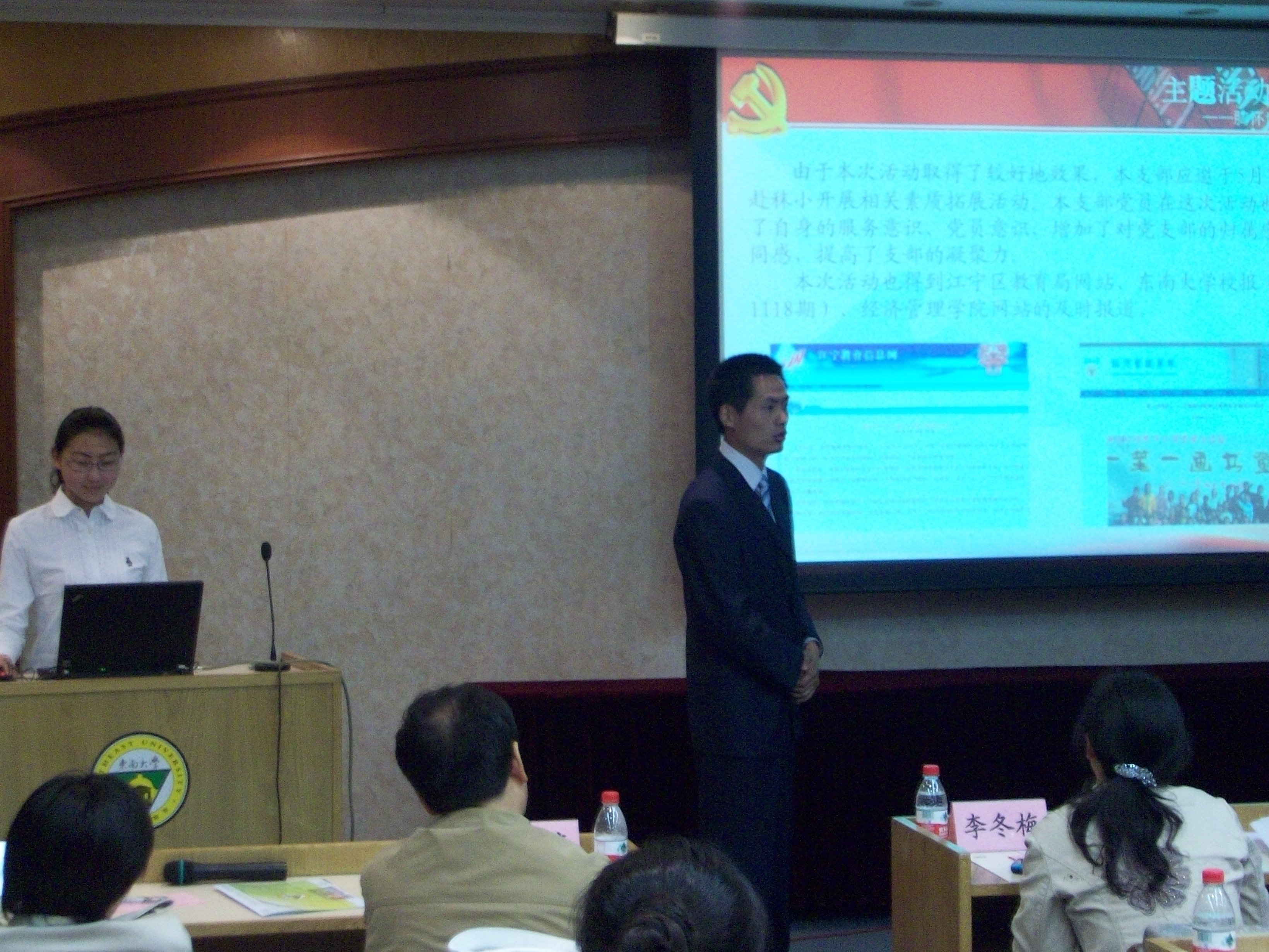 2011年5月26日晚,由我校党委研工部组织的2011年新葡的京集团8814vip“十佳”研究生党支部评选活动在四牌楼校区春晖堂落下帷幕,新葡的京官网09级硕士生第四党支部在激烈的公开答辩环节脱颖而出,喜获“十佳”研究生党支部评选第一名。 “十佳”研究生党支部评选是由党委研工部负责组织实施,每两年举办一届。通过对申报材料的初评,共有15个候选党支部进入公开答辩环节。在答辩环节,评优小组现场查阅党支部建设材料,听取各候选支部公开演讲并现场问答。 新葡的京官网09硕士生第四党支部通过图文并茂的展示、激情昂扬的讲演及规范严谨的材料获得评委的一致认可,得到评委老师和非候选党支部代表的赞扬。 09级硕士第4党支部不负众望,在“十佳”研究生党支部评选中拔得头筹,特此表示祝贺!