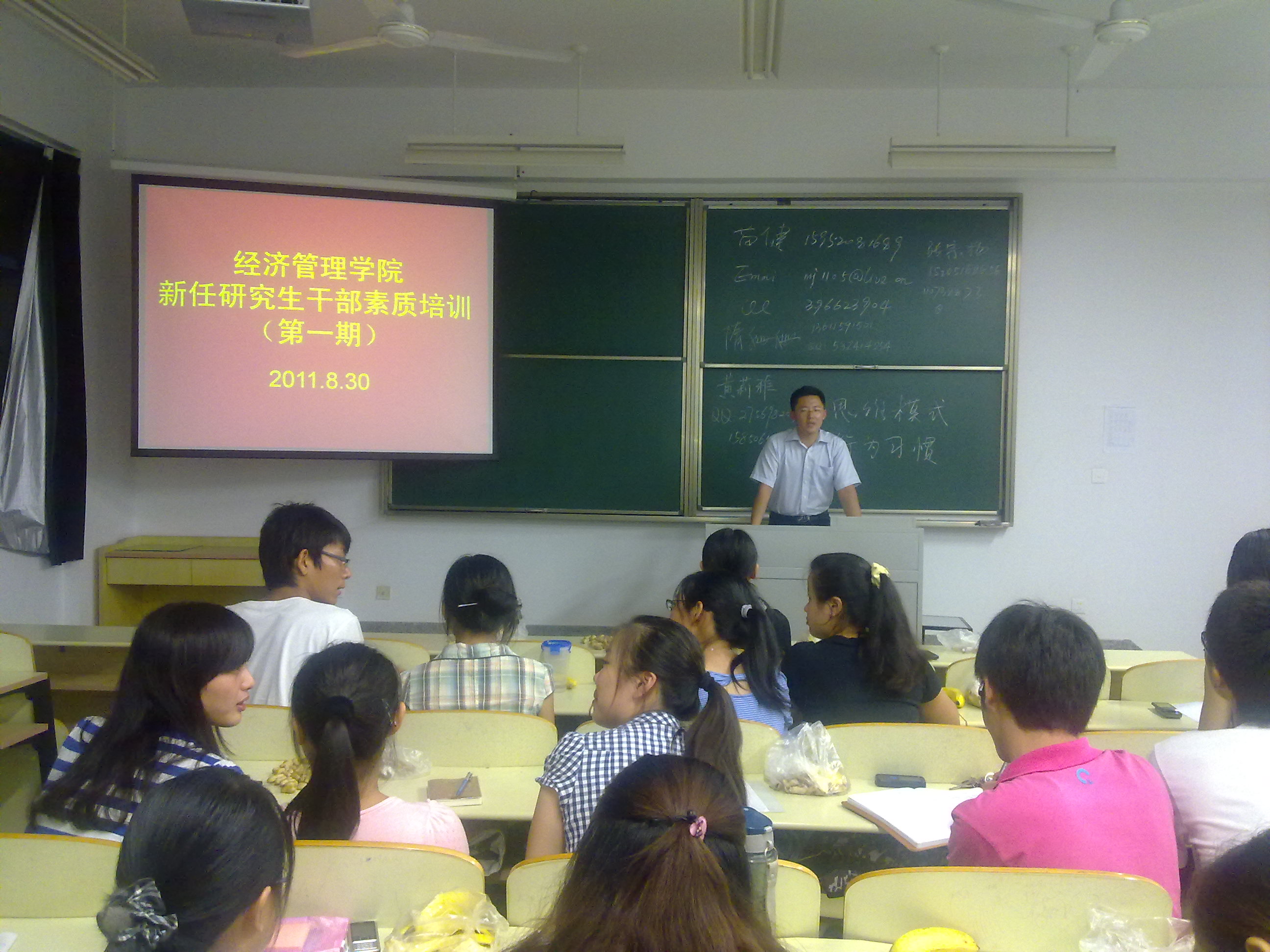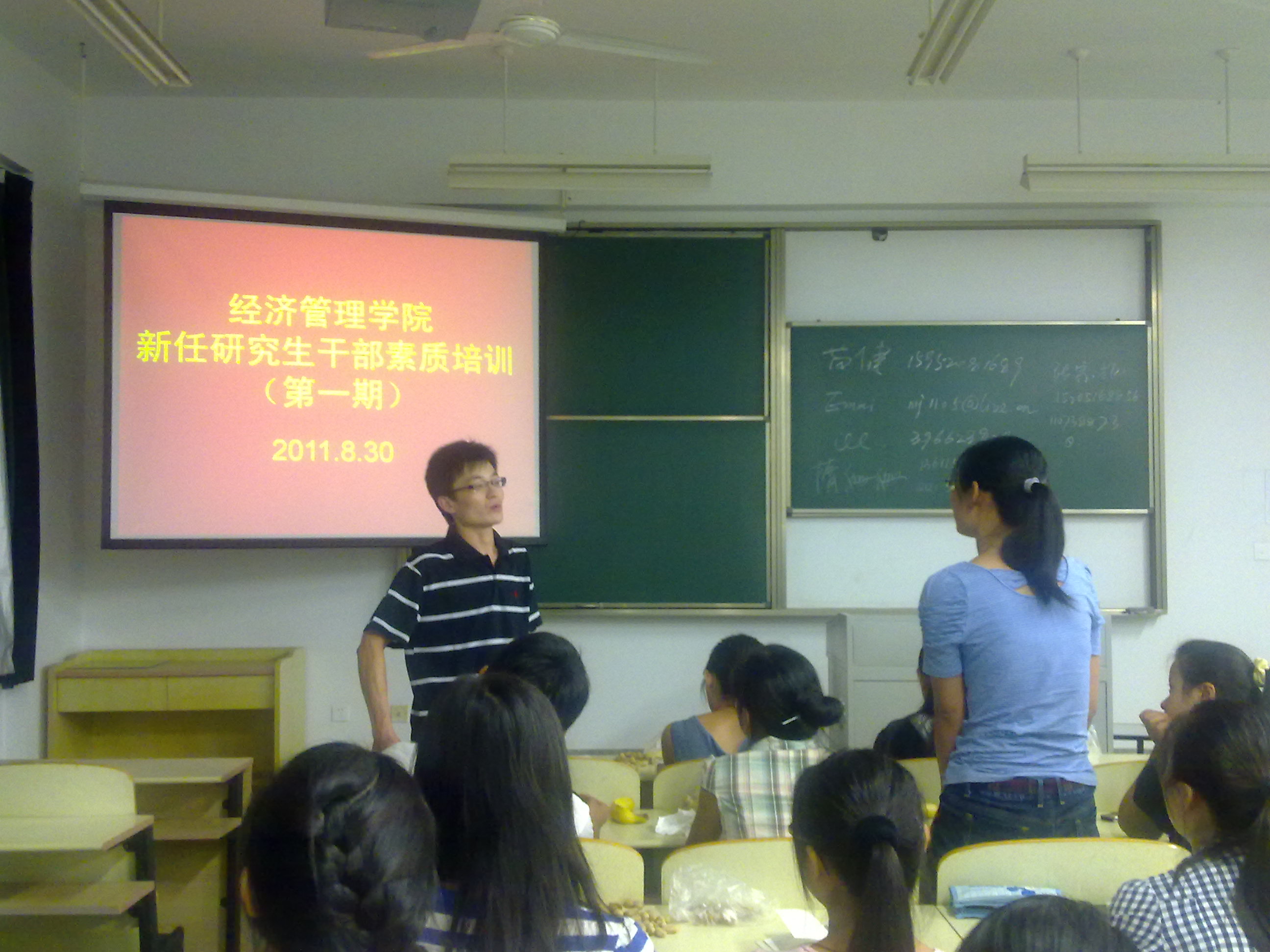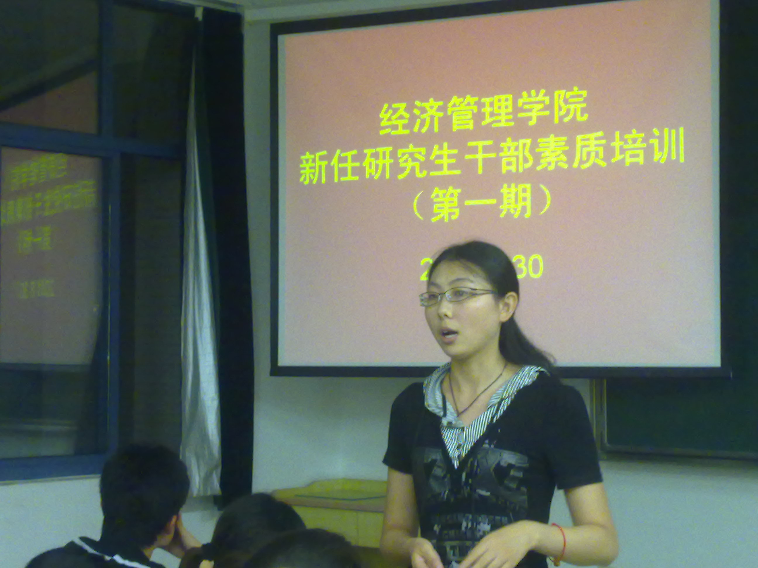 卢老师首先作了开场白,简要说明本次培训会的目的及意义。新葡的京集团8814vip09级硕士四班班长隋姗姗学姐,09级硕士第四党支部支部书记张宗扬学长,经管学院研究生会主席苗健学长,以及优秀黄莉雅学姐从多个层面和角度,针对如何做好一名学生干部、如何开展支部建设、如何协调学术研究与社会实践以及个人综合能力的培养等问题提出见解,催人奋进,启人深思。培训的第二个环节是交流互动,台下同学积极提出目前对研究生生涯存在的困惑,台上学长学姐悉心解答,现场气氛热烈活跃。在 此次培训会以优秀学长学姐的成长经历现身说法,使他们的模范作用更直观化、具体化,对新任研究生学生干部的个人能力培养和综合素质的提升有进一步的指导作用。会后,新任研究生干部纷纷表示“很有收获”,并期待这样的培训会能多多举办。 新葡的京官网历来对新任研究生干部素质培训工作高度重视,近期将继续开展系列活动以提高新任研究生干部的综合能力。(何林) 卢建老师作精彩开场白 隋姗姗学姐分享学习心得与工作经验 张宗扬学长图文并茂地介绍班级活动 苗健学长悉心答疑 黄莉雅学姐提出建议和鼓励 卢建老师作会议总结