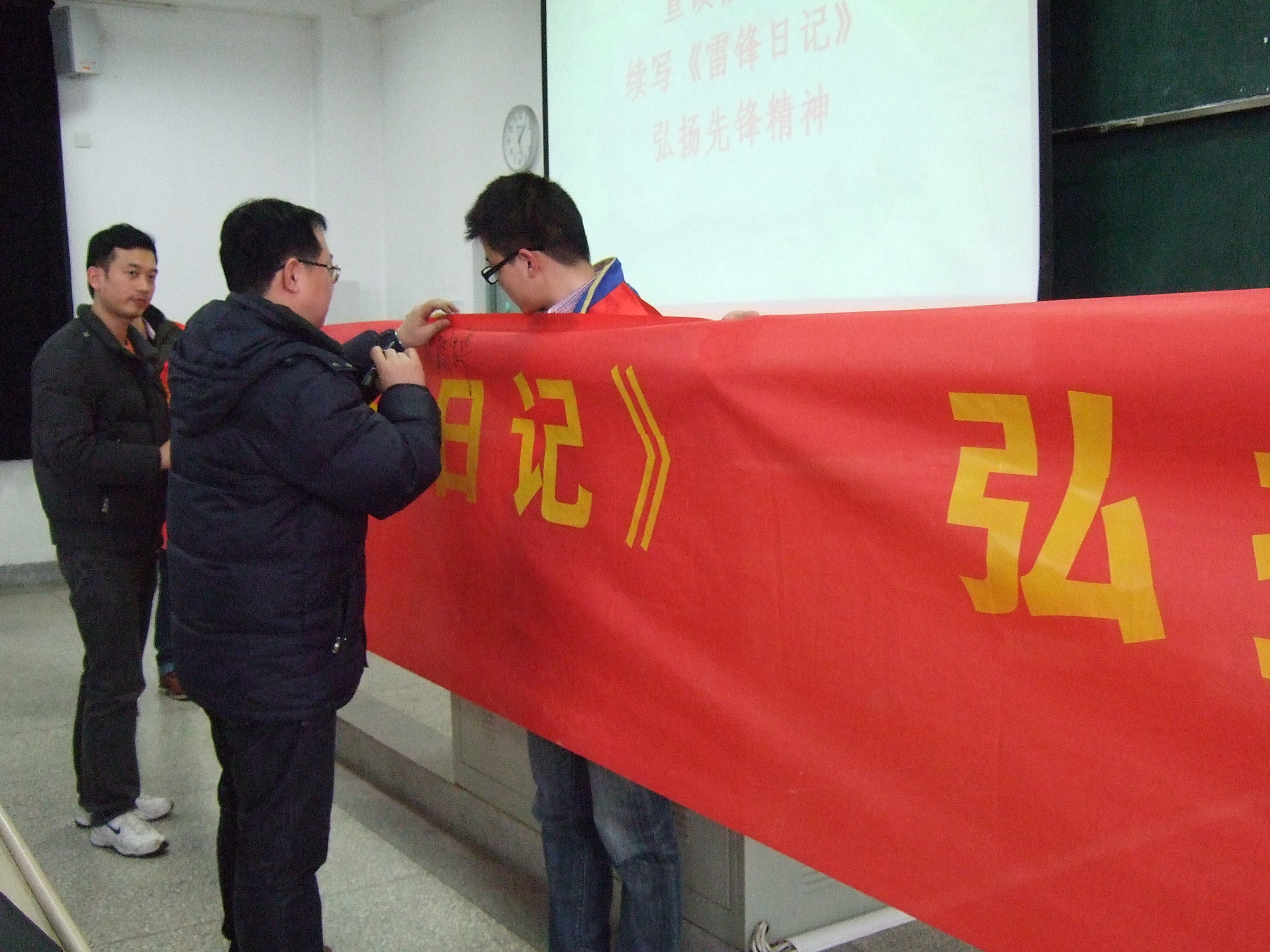 2012年3月5日新葡的京官网于教学楼J6-304发起“续写《雷锋日记》 弘扬先锋精神”的倡议并由此拉开系列活动的帷幕。倡议活动由院团委书记卢建老师主持,校团委副书记赵剑锋老师、院党委书记陈良华老师、院党委副书记兼副院长祝虹老师以及200余名党团员代表参与了倡议仪式。院研究生会常务副主席张津同学代表新葡的京官网全体学生宣读了倡议:倡议全体同学自强不息,争当先锋。关爱他人,乐于助人。服务人民,奉献社会。号召全体同学将学习雷锋精神落实到行动中去,要满怀激情地投入到青年志愿者活动中来,以实际行动迎接母校110周年校庆和党的十八大召开!倡议仪式结束后,赵剑锋书记、陈良华书记、祝虹书记以及部分党团员代表同学签名履行倡议。