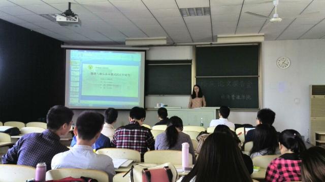 在报告会开始前,同学们提前到场,在工作人员的引导下将报告论文的PPT提前拷进电脑里。报告会开始后,同学们按照安排表顺序依次上台结合PPT阐述自己论文的总体框架、选题背景、研究问题、研究方法和研究意义等。专家老师们对每位学生的论文都分别从论文结构、研究方法、数据收集和分析方法等方面提出了存在的问题并给出中肯的建议,使同学们认识到自己论文存在的不足之处,明确了未来进一步改进的方向。