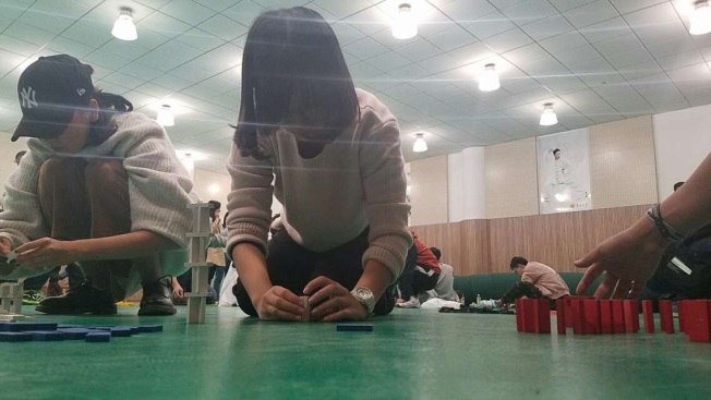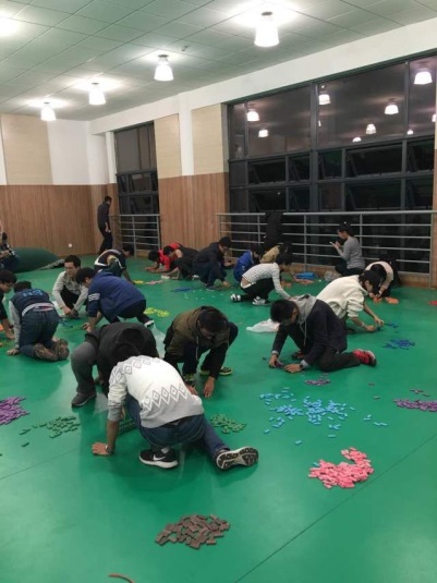 18:00,根据知识竞赛的得分高低,参赛小组依次选完了600块骨牌及5个机关,经过5分钟的试摆,大屏幕上60分钟的倒计时启动,选手们正式开始比赛。本次决赛的主题为“为东大做幅画”,经过一个星期的准备,7个小组都已有了自己心中的最美东大,图案设计早已了然于胸,现场摆放自然信手拈来,选手们所需要的,是绝对的专注和淡定的心态,稍有不慎,一牌倾倒,满盘皆输。