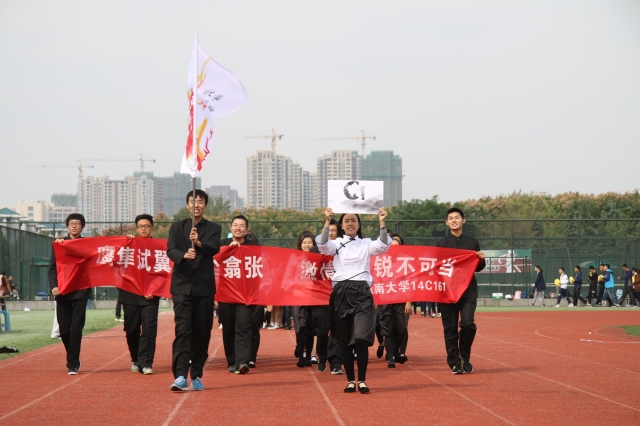 下午一点钟,院运会入场式正式开始,经管学院的各个班级方阵入场。同学们身着整齐的班服,精神抖擞,志气昂扬。充满想象力与创造力的他们想出了许多别出心裁的入场方式,他们脸上的笑容彰显着他们的活力与自信。