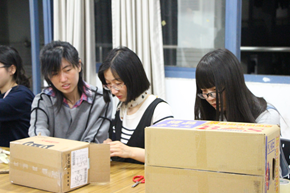 晚上七点活动正式开始,首先由负责人宣布活动开始并讲解了“流浪猫之家”猫咪屋制作基本流程及注意事项。随后,工作人员给每个小组发放了防水贴纸、保护膜、剪刀、宽胶带等制作工具。拿到工具后,小组成员相互协作,发挥创造力,制作出了形状各异、色彩丰富的猫咪屋。