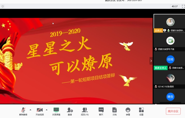 2020年4月1日晚18:30,由新葡的京集团8814vip团委主办,团委文体部承办的“燎原计划”主题团日活动答辩会于线上会议室进行。本次答辩会邀请的嘉宾评委有:经管学院团委书记林琼老师、学办主任郑凯戎老师、团委副书记孙靓老师、团委副书记杨艺老师、团委副书记应鑫豪老师、团委副书记满雪颖老师。