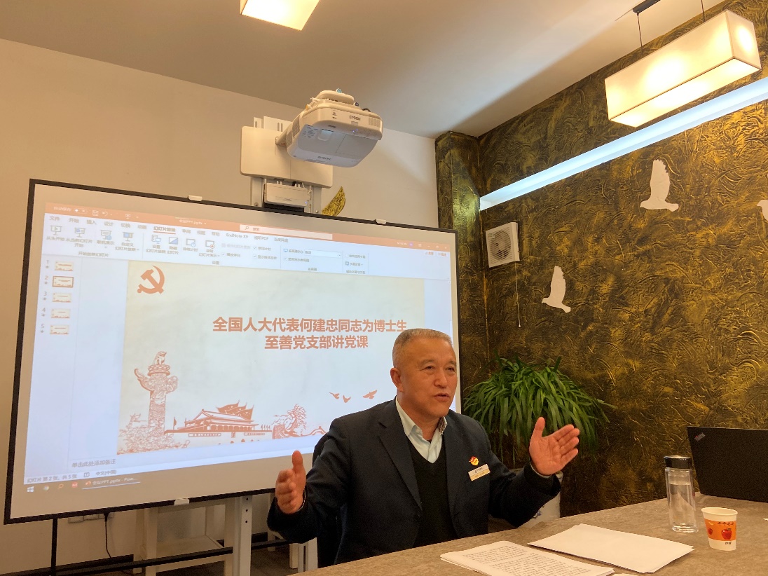 何健忠代表为支部成员们作了题为“不忘代表初心,牢记人民重托,不负时代使命”的主题教育专题党课。他分享了在邮政局本职工作和人大代表工作中的心路历程,始终不忘组织培养之情,牢记入党入职的初心;始终不忘群众信任之恩,永葆为民服务的诚心;始终不忘工作岗位之责,保持干事进取的恒心。同时,作为一名党员、一名基层工作者,关键是要立足岗位、干好工作,为党分忧、为民解难。通过坚守21个字原则:守初心、讲忠诚、敢担当、乐奉献、爱学习、善创新、懂敬畏,把初心和使命有效落实到具体工作之中。最后,他勉励党员同学们一是要有家国情怀,二是要有引领时代的思想,三是要有过硬的技能,四是要有精益求精的工匠精神,将民族的振兴、国家的强大作为个人的奋斗目标和人生追求。