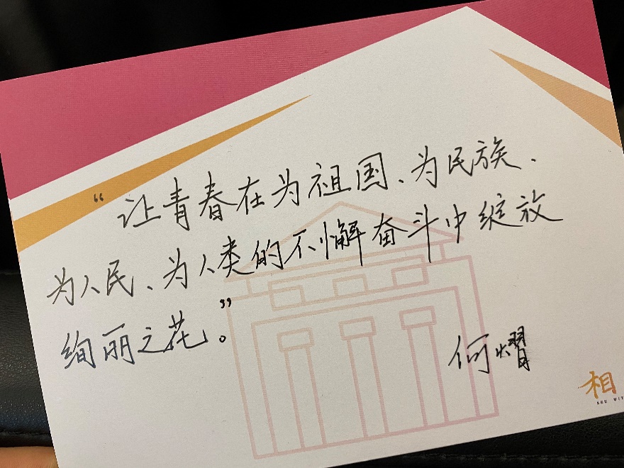 对于学生的其他问题,何书记也一一解答,并讲述了许多人生故事,同学们纷纷表示受益匪浅。答疑环节结束,何书记为大家写下“让青春在为祖国、为民族、为人民、为人类的不懈奋斗中绽放绚丽之花”的寄语。