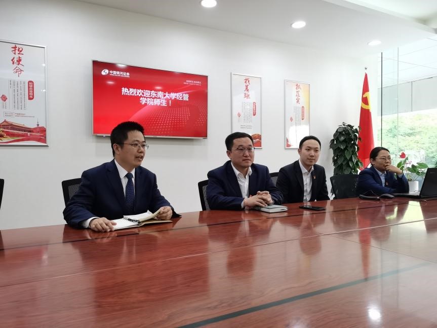 接着,金融系党支部书记尹威老师代表大家感谢了银河证券南京洪武路营业部提供的平台,简要介绍了新葡的京集团8814vip金融系党支部的情况,阐述了大学生党建教育的重要性,随后详细说明了本届“领航工程”和“师生共上党课系列活动”的党建目标、育人思路以及进度安排。接着,在金融领域发展日新月异的背景下,尹老师从教学和科研的视角剖析了理论教育应与实践教育相结合、打造实践育人平台的必要性。实践活动有利于同学们提升专业学习的动力、及时得知行业的发展变化,希望能和中国银河证券南京洪武路营业部党支部结对实现长期稳定的共建,强化党建的引领作用。最后,尹老师鼓励同学们应更好地理论联系实际,深入市场、走进企业,领略企业文化,接触从业人员,进一步加深对行业的认识,更好地学以致用。