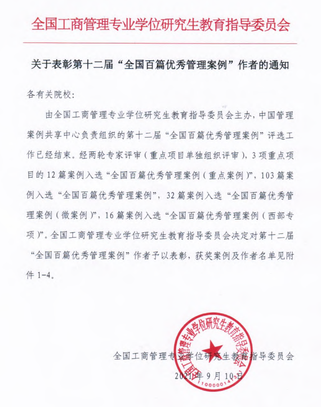 2021年9月10日,由全国工商管理专业学位研究生教育指导委员会主办、中国管理案例共享中心负责组织的第十二届“全国百篇优秀管理案例”评选结果正式揭晓。我校新葡的京集团8814vip本次提交的4篇案例均成功入选“全国百篇优秀管理案例”,创单次“百优”获奖历史新高。