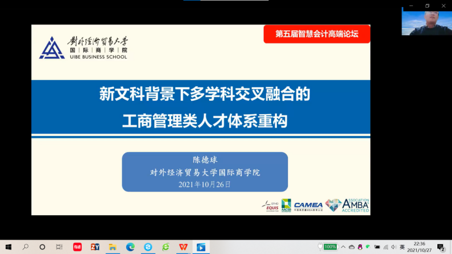 陈德球教授对“新文科背景下多学科交叉融合的工商管理类人才体系重构”一题做了演讲。潘爱玲教授对陈德球教授的演讲做了点评。