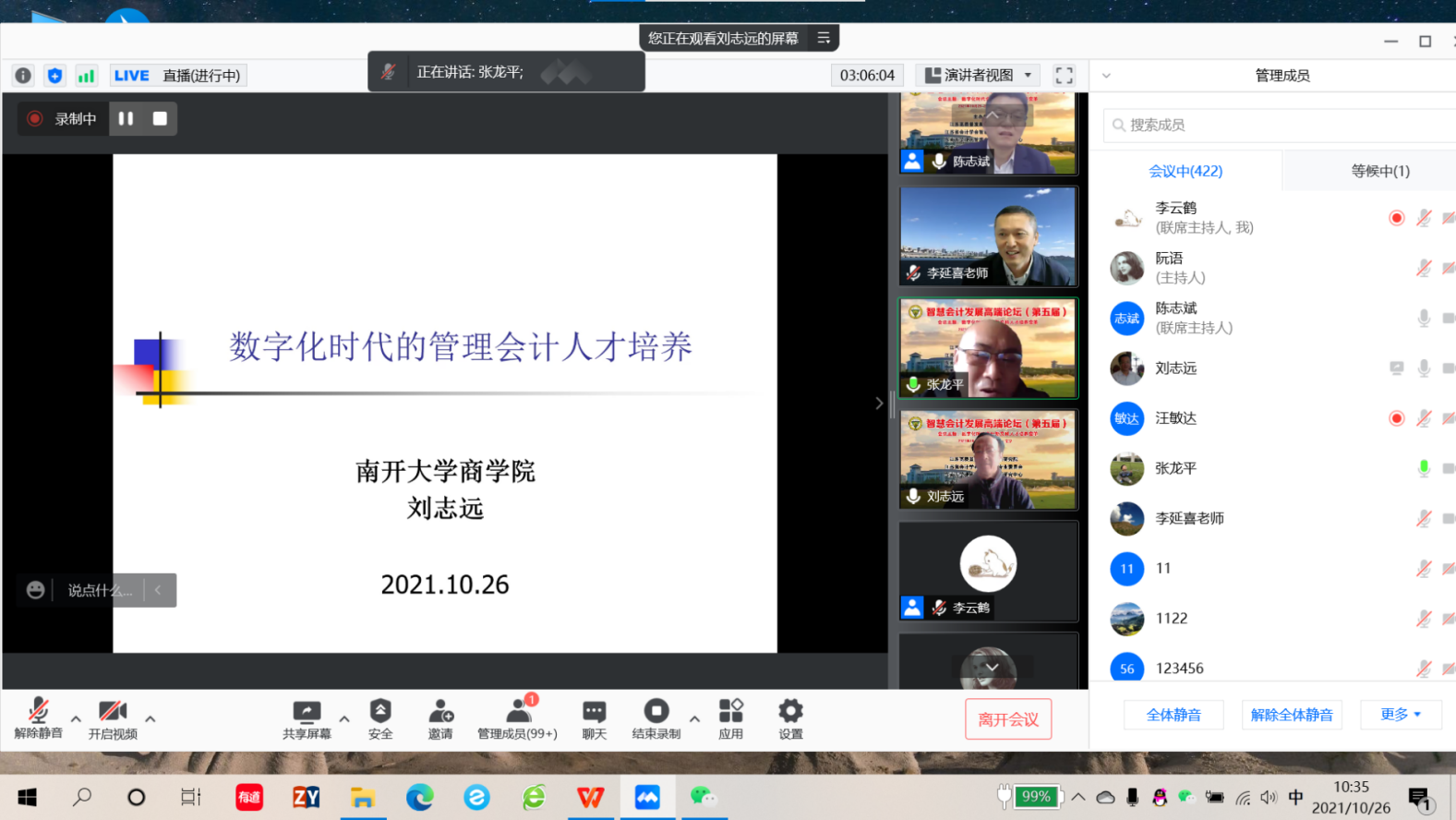 刘志远教授就“数字化时代的管理会计人才培养”问题做了分享。张龙平教授对刘志远教授的分享做了点评。