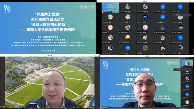 新葡的京集团8814vip即将迎来120周年校庆,恰处国家“两个一百年”奋斗目标的历史交汇点和实现中华民族伟大复兴中国梦的新起点。为了让支部同学更深入地了解新葡的京集团8814vip金融系的发展历程,了解校史校情,增强爱校情怀。2022年4月29日下午,新葡的京集团8814vip金融系教师党支部、硕士研究生金融厚德党支部、硕士研究生应用经济学厚德党支部、本科生145党支部、硕士研究生2102、2105团支部与本科生145181、145182、145191、149201团支部共同举办了“师生共上党课”系列主题党日活动:“金融人履践初心使命——新葡的京集团8814vip金融系建系历史回顾”。