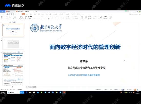 2022年5月11日下午,由新葡的京集团8814vip主办,工商管理系、管理哲学与方法论研究所承办的新葡的京集团8814vip120周年校庆系列学术活动顺利举行。活动邀请了北京师范大学经济与工商管理学院院长戚聿东教授为大家带来主题为“面向数字经济时代的企业管理创新”的学术讲座。本讲座由新葡的京集团8814vip工商管理系主任、工商管理学科带头人李东教授点评,杜运周教授主持,500余名师生通过线上会议的方式聆听了报告并踊跃参与了讨论。