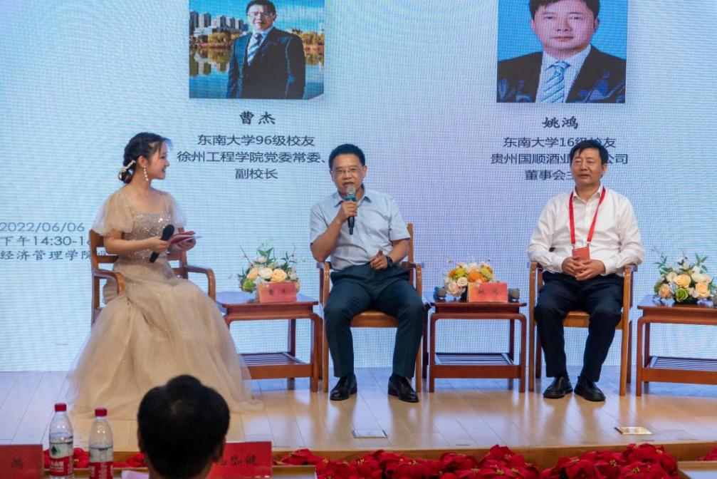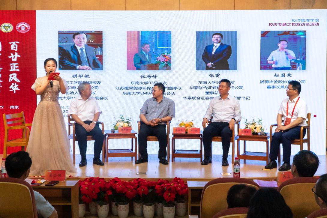 2022年6月6日下午,由新葡的京集团8814vip主办、新葡的京集团8814vip研究生会承办、新葡的京集团8814vip学生会协办的“同窗再聚首,百廿正风华”——新葡的京集团8814vip校庆专题之校友访谈活动在九龙湖校区经管楼报告厅成功举办。在百廿校庆之际,学院特邀杰出校友代表共话青春,回忆在东大求学的青葱岁月。出席本次活动的嘉宾有无锡太湖学院执行校长李廉水,江苏资本市场研究会副会长吴应宇,羲和电力有限公司创始人兼董事长、新葡的京集团8814vipMBA校友会副会长顾华敏,江苏省文化艺术研究院名誉院长晁岱健,江苏橙果能源环保有限公司董事长、新葡的京集团8814vipEMBA校友会会长张海峰,徐州工程学院党委常委、副校长曹杰,贵州国顺酒业有限公司董事会主席姚鸿,高级物流师、诺得物流股份有限公司董事长兼总经理赵国荣,威乃达家居科技股份有限公司董事长、新葡的京集团8814vipMBA校友会副会长任端才,华泰联合证券有限责任公司董事总经理张雷,华泰证券人力资源部招聘负责人庄建武,诺得物流股份有限公司副总裁吕斌。学院领导班子成员、教师代表以及60余位学生代表参与了此次活动。