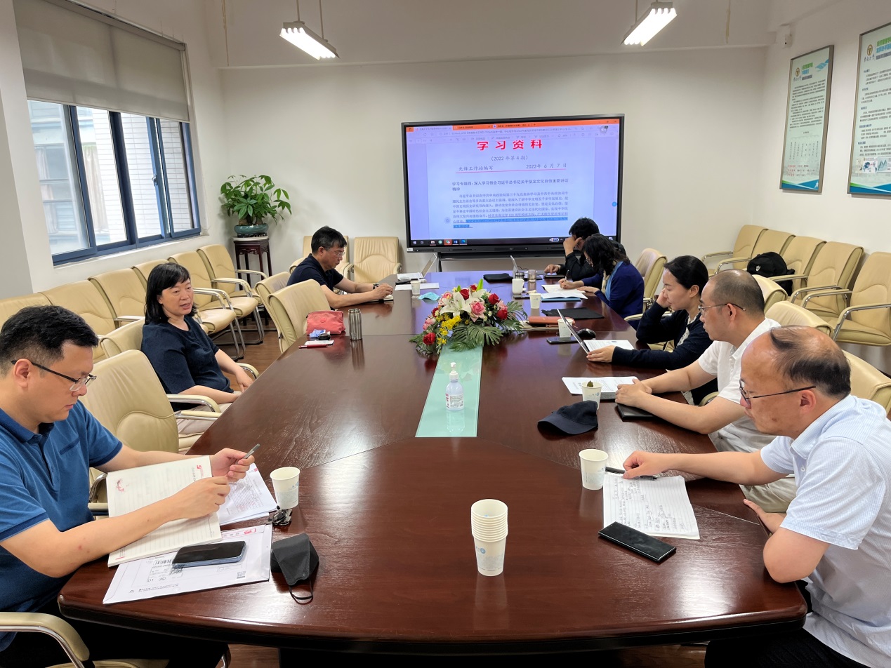 会上,袁健红同志领学并表示,要进一步学深悟透习近平总书记关于推动增强历史自觉坚定文化自信的重要思想。必须把增强广大师生文化自信融入思想政治教育和社会科学教学的全过程,增强广大师生对中华优秀传统文化、革命文化、社会主义先进文化的认知和认同。不断加强学院对外的宣传,注重正面引导和优化环境,发现并鼓励那些具有坚定文化自信的先进典型,发挥他们的示范引领作用,全面提升广大师生的文化自信。