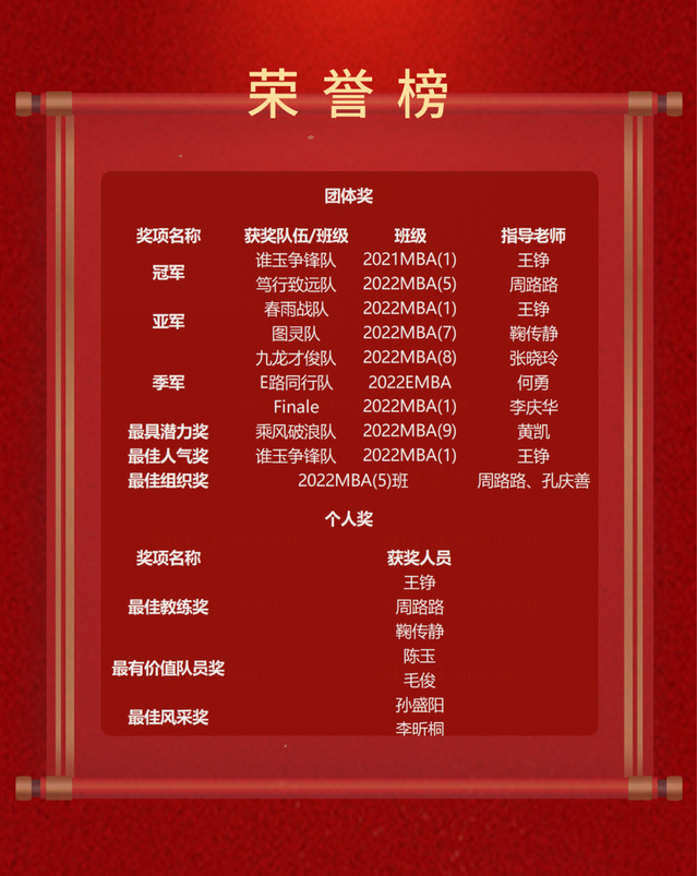 经过赛前盲审和现场竞技的综合评分,最终决出了比赛名次。荣获冠军的是王铮老师指导的2021MBA(1)班谁玉争锋队、周路路老师指导的2022MBA(5)班笃行致远队。荣获亚军的是王铮老师指导的2022MBA(1)班春雨战队、鞠传静老师指导的2022MBA(7)班图灵队。荣获季军的是张晓玲老师指导的2022MBA(8)班九龙才俊队、何勇老师指导的2022EMBA E路同行队、李庆华老师指导的2022MBA(1)班Finale队。