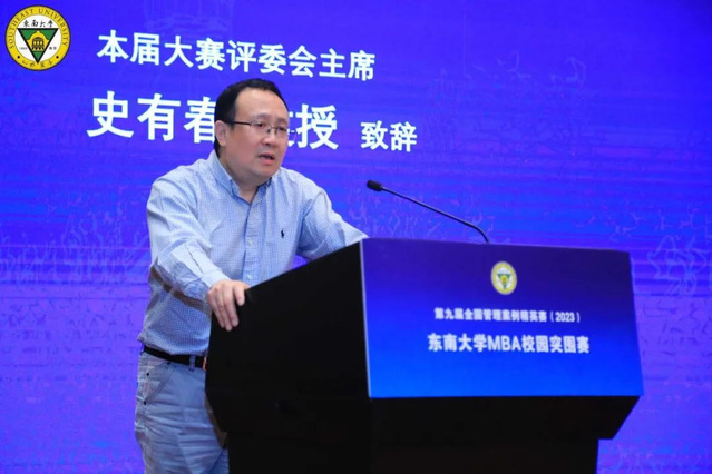 本届大赛评委会主席、南京大学史有春教授致辞。史教授指出,案例教学是MBA教学的一个重要教学方式,也是主流的教学方式,案例大赛应当成为案例教学里一个最高层次的教学方式。针对案例教学,他建议同学:第一,需要具备基本的管理常识,同时学习获取信息的方式;第二,需要掌握案例分析的框架、方法和思路;第三,通过信息的获取,积攒解决常规问题的方法和经验;第四,实践出真知,要在实践中掌握获取知识的能力。最后,史教授宣布案例大赛开始,就此拉开了各队赛场“论剑”的帷幕。