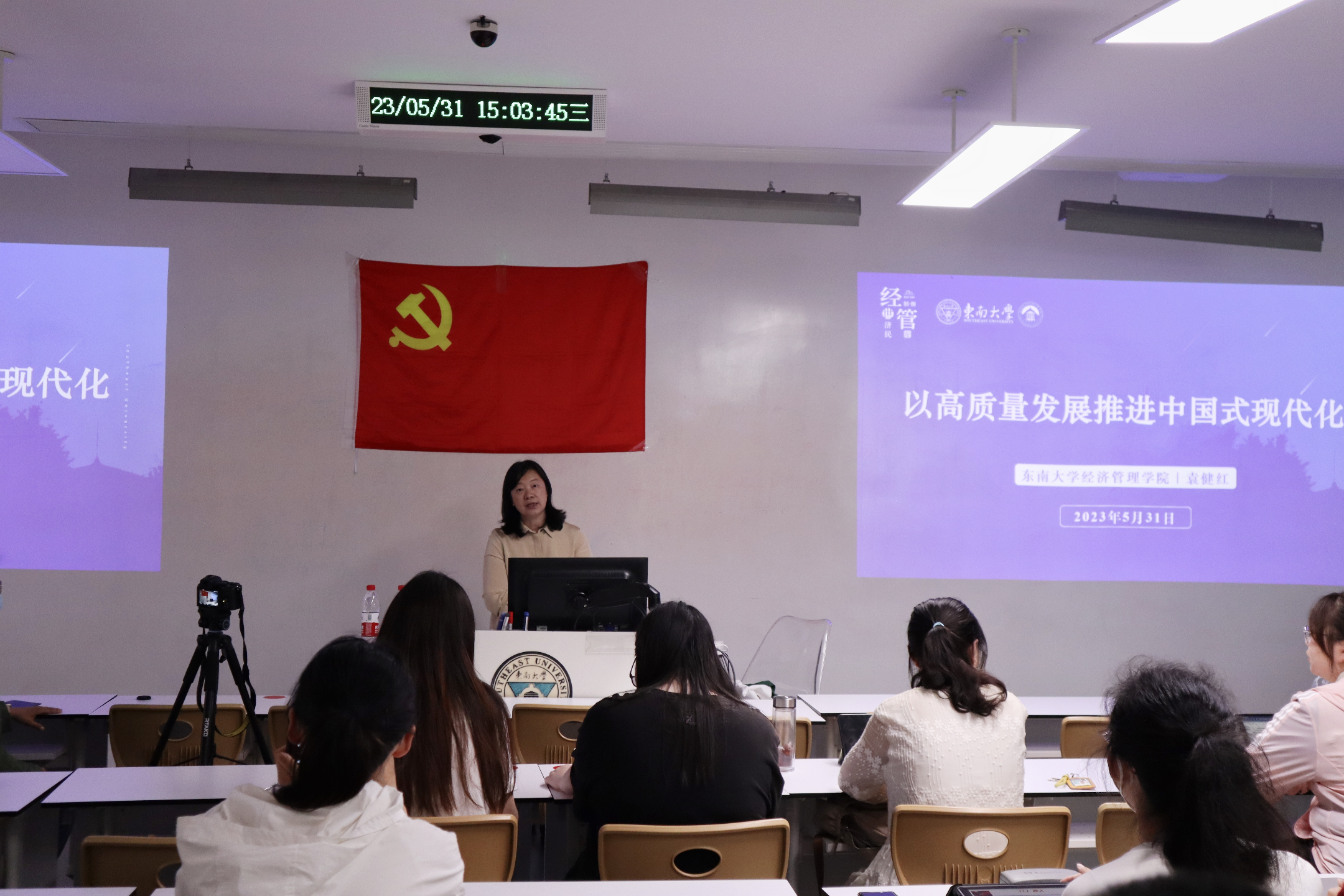 2023年5月31日下午,为深入学习贯彻党的二十大精神,新葡的京集团8814vip党委举办献礼二十大“党课20讲”系列活动。本次党课邀请了新葡的京集团8814vip党委书记袁健红为大家带来了题为《高质量发展推进中国式现代化》的专题党课。党课由本科生先锋党支部书记、2020级本科生辅导员孙成龙主持,新葡的京集团8814vip党务秘书、博士研究生辅导员孙靓和本科生先锋党支部党员参加党课学习。