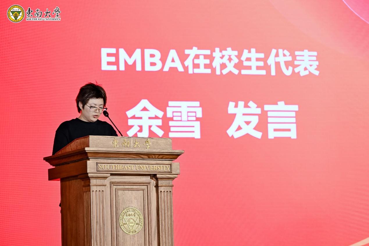 MBA在校生代表赵恒星同学介绍了丰富多彩的MBA学习生活,她通过参加案例赛、亚沙赛以及国演赛等赛事的经历,分享了在新葡的京集团8814vip学习生活中获得专业管理知识的提升、思维模式的改变等方面的收获。EMBA在校生代表余雪同学从收获颇丰的企业实践谈起,启发学弟学妹们不仅要注重课堂学习,更要学会融会贯通,从实践中汲取成长的养分。