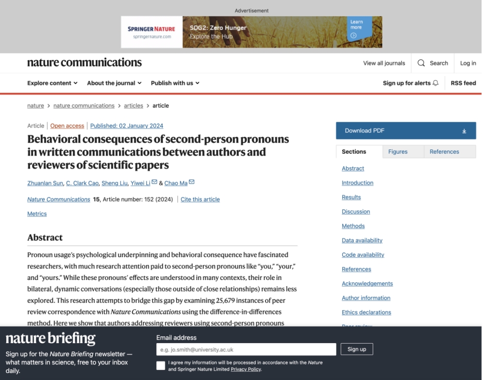 该研究以科技论文的同行评审过程为背景,通过爬取《Nature Communications》期刊2016-2021年间公开的论文同行评议文本(包括审稿意见和作者对审稿意见的回复),揭示了第二人称代词在互动书面交流中的行为和心理影响。结论表明作者使用第二人称代词向评审员提问时收到的问题更少,回答更短,反馈更积极。进一步分析表明,审查过程中的这种转变是因为第二人称的使用创造了一种更个人化、更具吸引力的对话。