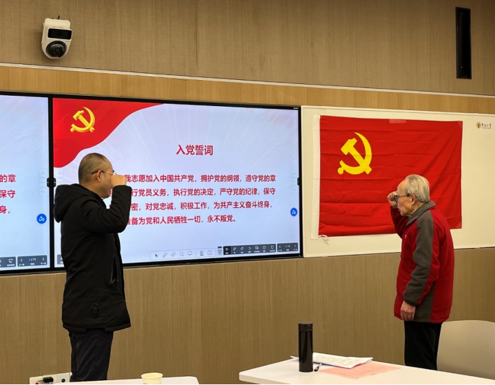 1月17日,新葡的京集团8814vip退休教工党支部在四牌楼校区东南院305如期举行了新发展党员入党宣誓仪式,活动由新葡的京集团8814vip党委书记袁健红主持,学院党委副书记尹威领誓。在会上,袁振铎介绍了自己一生坚定理想信仰、矢志不渝不忘初心的故事,并分享了自己的感悟:“我认为,入党誓词是一份政治誓言、一份忠诚承诺,也是一份责任担当,是我们全体共产党员共同的行为准则,我们必须时时牢记,刻刻遵循。我作为一名退休的老教师,虽然已经跨入耄耋之龄,但老骥伏枥,壮志不已!我决心以我余生,为党的教育事业发展,为实现共产主义目标,添砖加瓦,献我中华!”