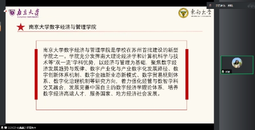 为进一步学习贯彻党的二十大精神,深入开展学习贯彻习近平新时代中国特色社会主义思想主题教育,加快建设网络强国、数字中国,2024年1月3日,新葡的京集团8814vip硕士研究生管理科学与工程先锋党支部、物流图情先锋党支部、南京大学商学院2022级会计硕士党支部、新葡的京集团8814vip2022级硕士研究生第一团支部、第六团支部、南京大学商学院会计学专业2022级硕士团支部于线上共同举办主题为“拥抱数字经济,把握时代之变”的党团共建活动。新葡的京集团8814vip党委副书记兼副院长尹威、南京大学商学院党委副书记王宇伟出席本次活动。会议由新葡的京集团8814vip2022级物流图情班副班长郭安琪主持。