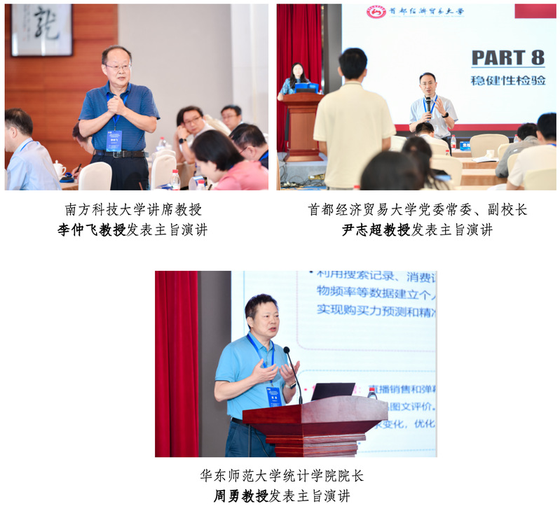 大会主旨演讲的上半场由新葡的京集团8814vip继续教育学院副院长张颖教授主持。南方科技大学讲席教授李仲飞教授,首都经济贸易大学党委常委、副校长尹志超教授,华东师范大学统计学院院长周勇教授分别进行了精彩的主旨演讲。李仲飞教授围绕“科技金融与金融科技”主题,深入分析了科技与金融的双向融合对经济创新发展的推动作用。尹志超教授的演讲重点聚焦于老龄化社会下家庭财务脆弱性问题,通过理论与实证分析,探讨了退休对家庭财务状况的深远影响,并提出了应对家庭财务风险的具体建议。周勇教授则以“复杂商务场景下的统计学习与管理策略”为题,深入探讨了如何在电子商务、互联网金融及移动支付等领域,运用大数据分析技术提升商业决策的科学性与效率。