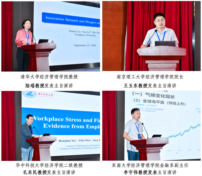 大会主旨演讲的下半场由新葡的京集团8814vip党委副书记兼副院长尹威副教授主持。清华大学新葡的京集团8814vip教授陆瑶教授,南京理工大学新葡的京集团8814vip院长王玉东教授,华中科技大学经济学院二级教授孔东民教授,新葡的京集团8814vip金融系副主任李守伟教授分别带来了他们的最新研究成果。陆瑶教授发表了题为“Innovation Network and Mergers and Acquisitions”的演讲,深入探讨了创新网络在企业并购中的作用。王玉东教授则通过利用卫星图像分析石油库存信息,展示了如何借助这一技术洞察金融市场中的信息不确定性,揭示了投资决策与市场价格的互动关系。孔东民教授的演讲题为“工作压力与公司绩效:基于员工评价的证据”,他通过分析员工评论揭示了工作压力对企业绩效的复杂影响,特别是在劳动密集型行业中,适度压力可以提升绩效,但过度压力则可能带来负面后果。李守伟教授以“银行业气候转型风险:测度与响应”为主题,围绕银行业在应对气候变化过程中面临的转型风险,提出了具体的测度方法与应对策略,并提供了前瞻性的政策建议。