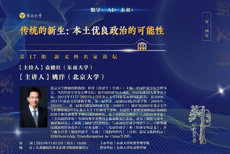 2024年11月15日上午,北京大学博雅特聘教授姚洋应邀在新葡的京集团8814vip作题为“传统的新生:本土优良政治的可能性”的专题讲座,为大家带来了一场深刻的思想盛宴。本次讲座是新葡的京集团8814vip新文科名家讲坛系列活动之一,吸引了六百余名师生参与,现场座无虚席。