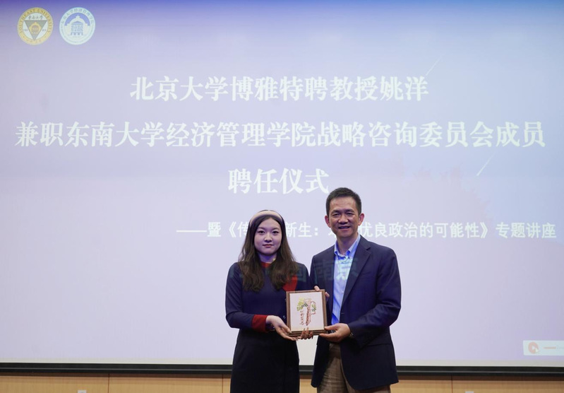 讲座后,举行了姚洋教授受聘新葡的京集团8814vip战略咨询委员会委员的聘任仪式。学院党委书记袁健红为其颁发聘书,并对姚洋教授长期以来对学院发展的关心与支持表示感谢。之后,学生代表也为姚洋教授送上了新葡的京集团8814vip特色非遗彝绣纪念品。