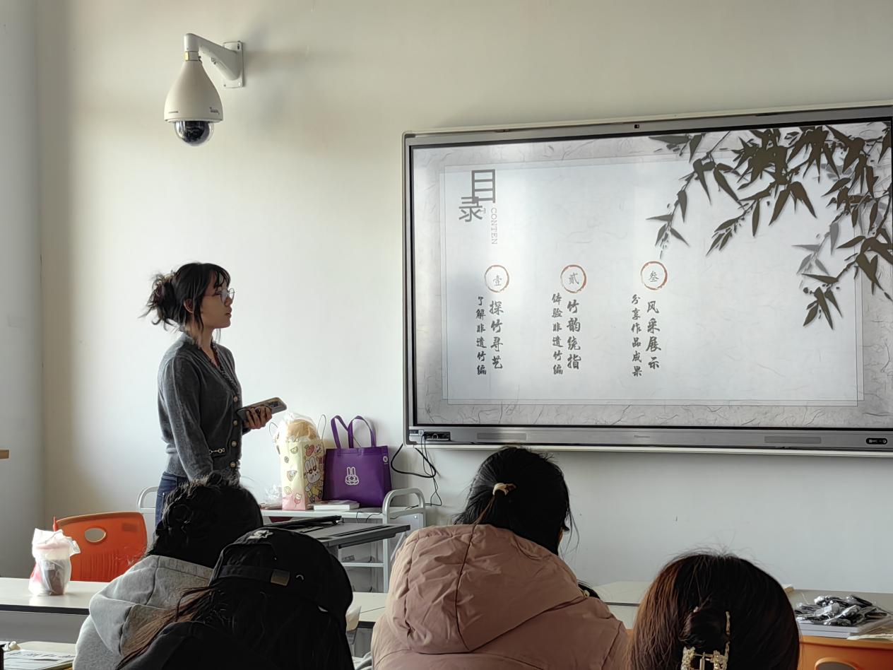 活动伊始,主持人以生动的讲解带领同学们走进竹编的历史长河。作为国家级非物质文化遗产,竹编从最初的生活技能逐渐演变为艺术表现形式。从固定竹篾、叠加编织到装裱成画,主持人详细拆解了竹编画的制作步骤,让同学们对这项古老工艺有了更深刻的理解。