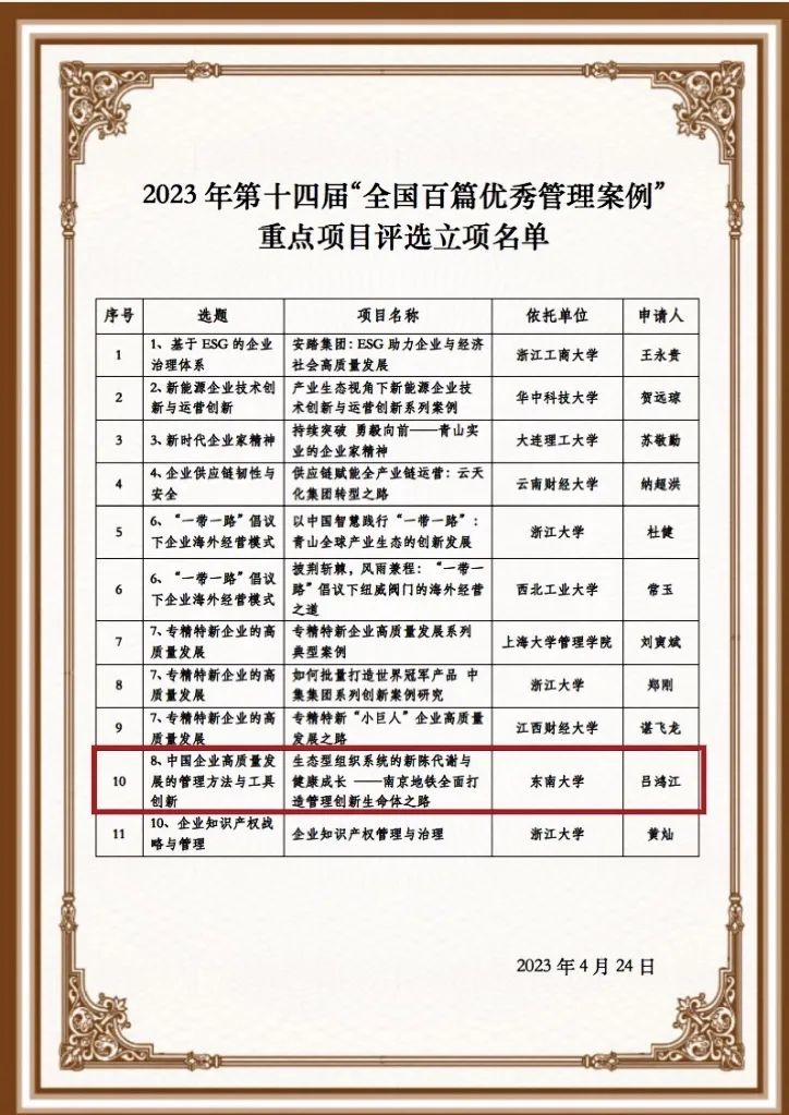 On April 21, 2023, the key project initiation review meeting of the 14th "National Top 100 Excellent Management Cases" was held in Wuhan, Hubei, which was hosted by the China National MBA Education Supervisory Committee and organized by the China Management Case-Sharing Center. Professor Lv Hongjiang of our school got key project initiation approval for the case study "The Metabolism and Healthy Growth of an Ecological Organizational System: The Management Innovation of Nanjing Subway", achieving the first breakthrough for our school in this type of case study project!