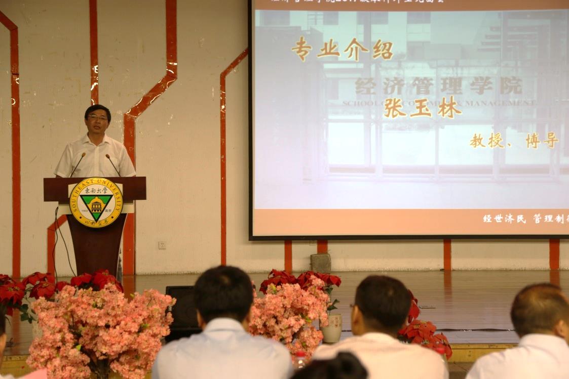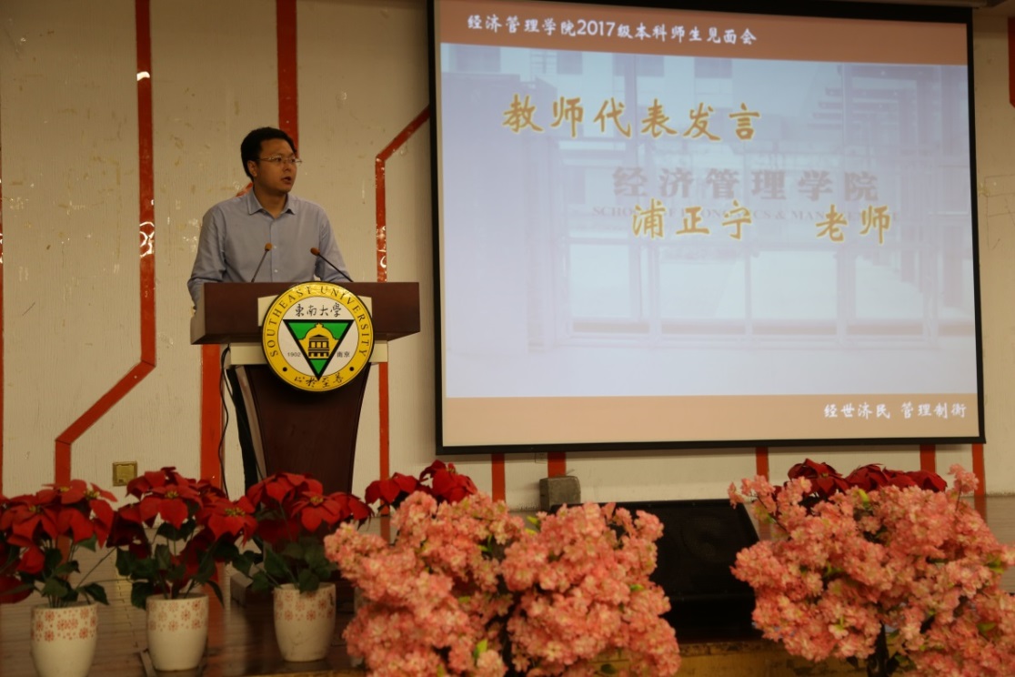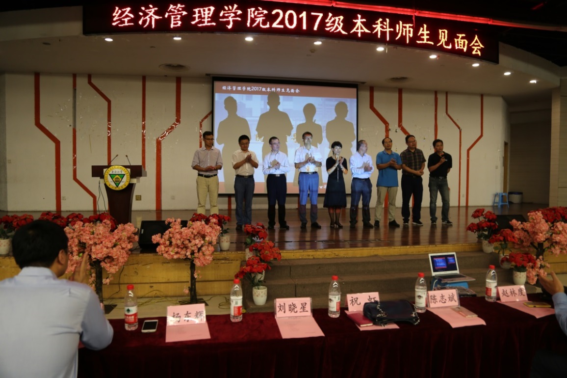 随后,张玉林副院长作学院学科专业设置及本科人才培养情况介绍。经济学系副系主任浦正宁老师、2017级工商管理类新生陈泰宇同学分别作为教师和新生代表发言。接下来,院党委副书记兼副院长祝虹老师,院长助理王海燕老师、邵军老师,院长助理、金融系主任刘晓星老师,会计学系主任陈志斌老师,管理科学与工程系党支部书记杨东辉老师,国际经济与贸易系主任刘修岩老师,工商管理系副主任葛沪飞老师,物流管理工程系、电子商务系副主任孙胜楠老师集体登台寄语,对新生同学们表达热烈欢迎并提出殷切期望。